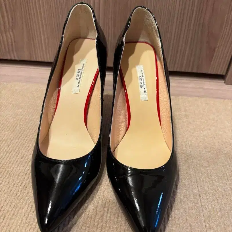 에나멜 마감의 블랙 스틸레토 힐, 레드 힐이 특징입니다. - 색상: 블랙 - 힐 색상: 레드 - 디자인: 스틸레토 - 소재: 에나멜 - 힐 높이: 하이힐 방문해 주셔서 감사합니다. 2시간 정도만 신었습니다. 예쁜 펌프스이므로 다이애나, 에스페란자, 란다를 좋아하는 분들에게도 추천합니다!