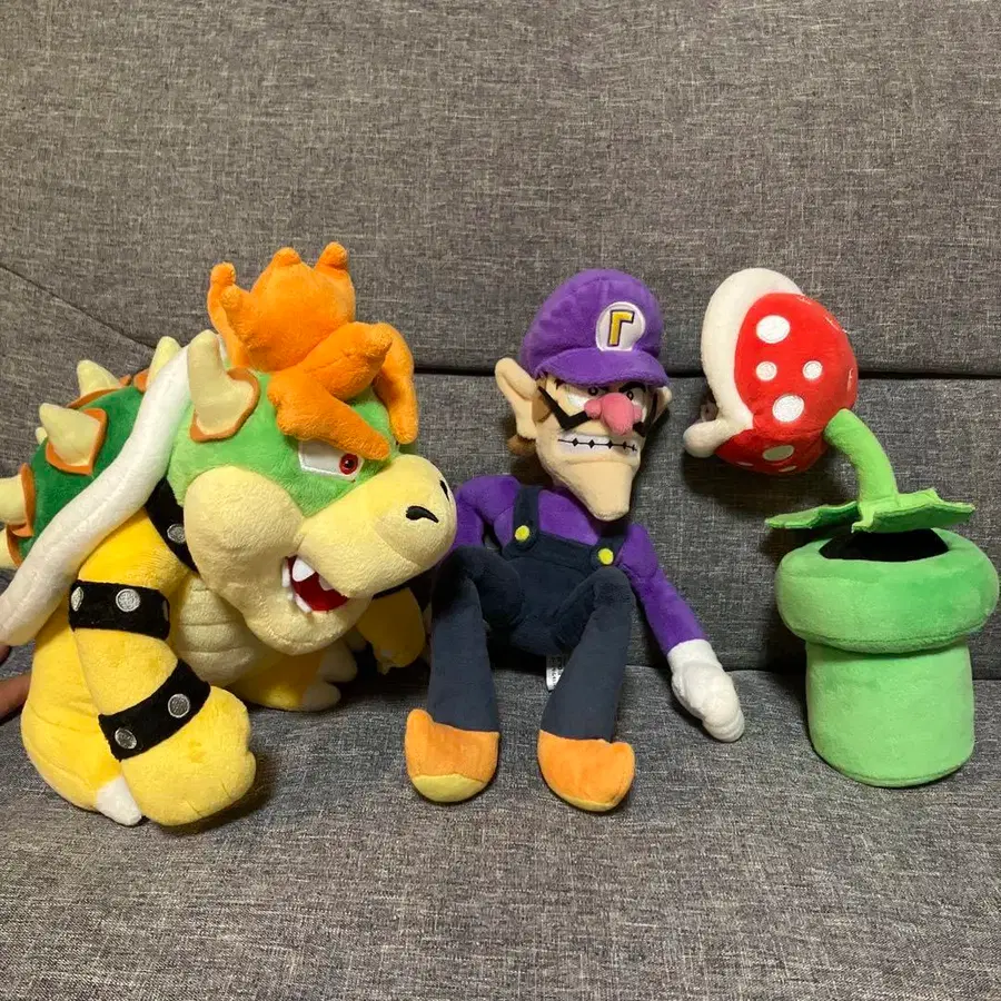 슈퍼 마리오의 쿠파, 와이 루이지, 팩맨 플라워 봉제 인형 3개 세트입니다. 집에 장식해 두었습니다. 택은 없습니다. 낱개 판매 가능합니다. 슈퍼 마리오 마리오 루이지 팩맨 플라워 와이 루이지 쿠파