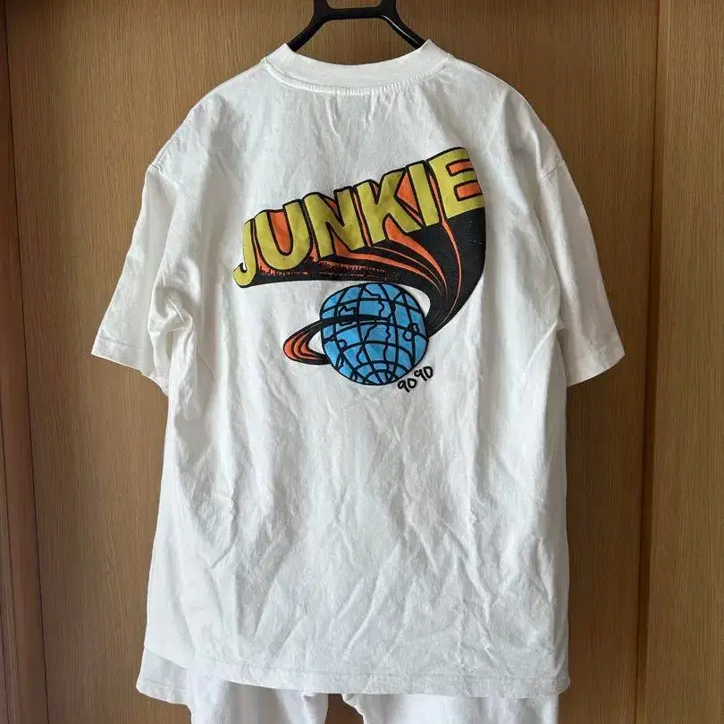 프론트와 백에 'JUNKIE' 로고가 들어간 화이트 티셔츠 셋업. 나고야의 yutori 팝업에서 구입했습니다. - 디자인: 프론트에 'JUNKIE' 로고와 그래픽 - 디자인: 백에 큰 'JUNKIE' 로고와 지구 그래픽 - 색상: 화이트 - 소재: 코튼 9090 yutori ♯9090 ♯yutori ♯유토리 ♯세트 방문해 주셔서 감사합니다.