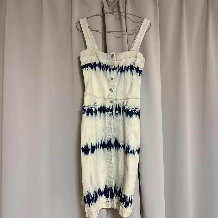 화이트와 네이비의 타이다이 디자인의 데님 슬리브리스 미니 원피스.