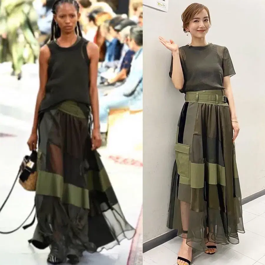 택 포함 새상품 CoutureBrooch 티어드 롱 스커트 카키 L