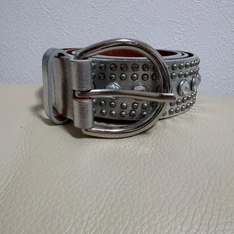 스터드와 크리스탈 장식이 있는 실버 가죽 벨트. - 컬러: 실버 - 디자인: 스터드 부착 - 소재: 가죽 - 버클 타입: 원형 버클 방문해 주셔서 감사합니다. 꽤나 번쩍번쩍합니다. 사진 4번째 더러워진 부분이 있습니다. NCNR