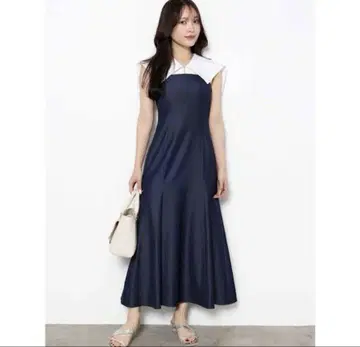 • Gauze 네이비 셔츠 롱 원피스 A라인 7부 소매