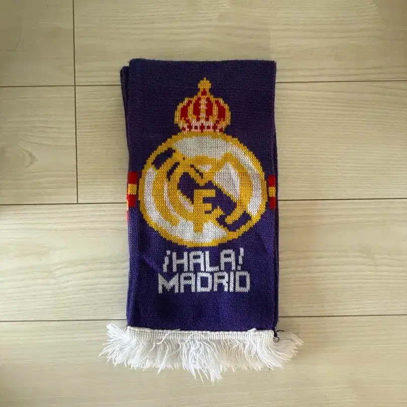 레알 마드리드 로고가 특징적인 보라색 머플러. - 디자인: 레알 마드리드 로고와 슬로건 '¡Hala! Madrid'가 디자인된 머플러 - 컬러: 보라색과 흰색 배색 - 소재: 프린지가 달린 니트 소재 - 사이즈: 직사각형 모양, 일반적인 머플러 사이즈 - 특징: 양면에 디자인이 적용됨 방문해 주셔서 감사합니다.