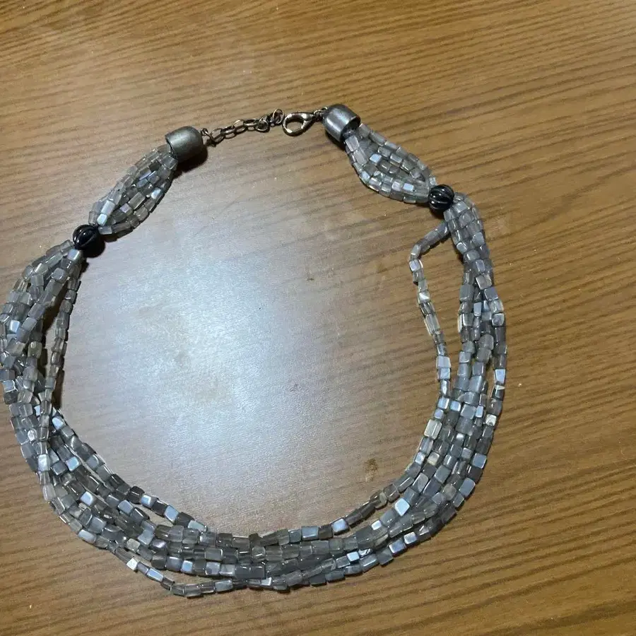 그레이 계열의 다층 비즈 목걸이, 실버 톤의 금속 장식. - 컬러: 그레이 계열 - 소재: 비즈 - 스타일: 다층 목걸이 - 잠금장치: 클래스프식 - 특징: 실버 톤의 금속 장식 - 디자인: 비즈 엮음 디자인 방문해 주셔서 감사합니다.
