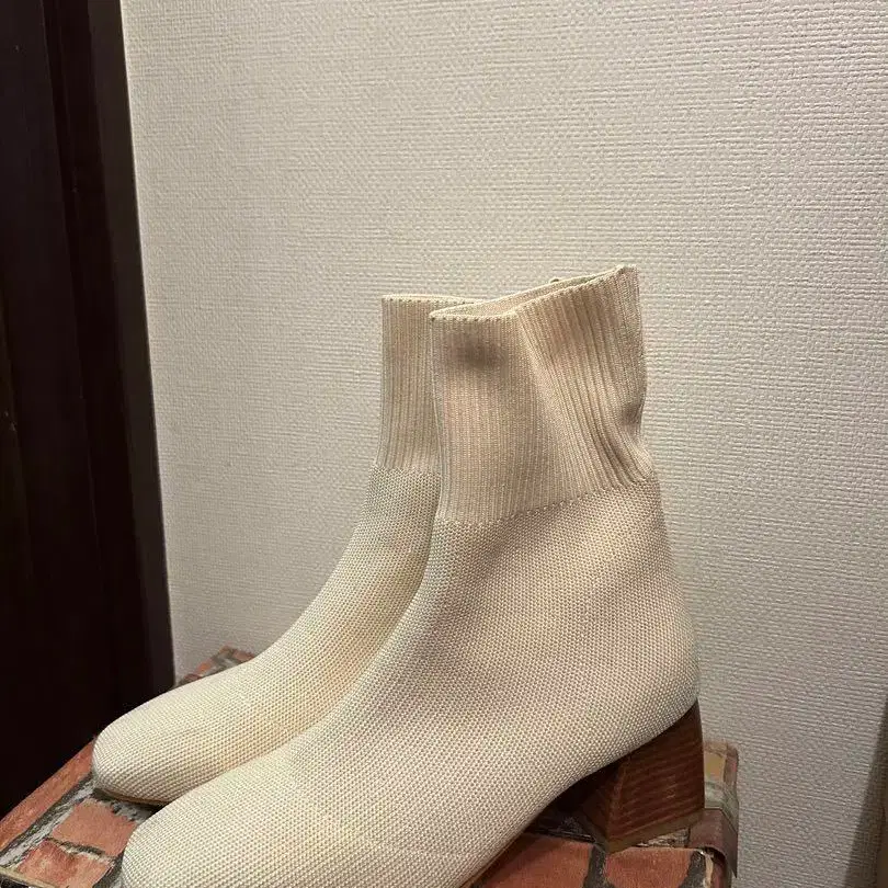 아이보리 니트 소재의 슬립온 스타일의 미들 힐 부츠. - 색상: 아이보리 - 소재: 니트 - 힐 높이: 미들 힐 - 디자인: 슬립온 스타일 - 밑창 형태: 블록 힐 방문해 주셔서 감사합니다. 해당 상품은 거의 신지 않은 새 상품이지만, 신발장에 보관하던 중 앞쪽이 사진과 같이 더러워졌습니다. 실제로 보시면 눈에 띄지 않습니다.