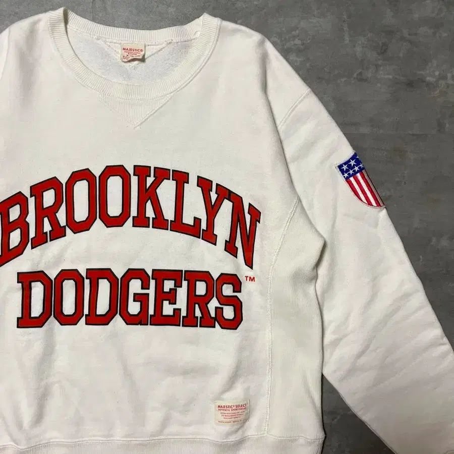 로스앤젤레스 다저스의 전신인 브루클린 다저스의 가제트가 부착되어 있으며, 플로키 프린트와 배지가 장식된 클래식 스타일의 맨투맨입니다.