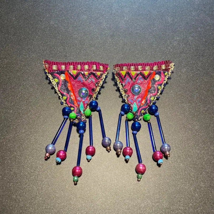 미국 빈티지 샵에서 구입한 컬러풀한 민족풍의 귀걸이입니다. 천과 라인스톤, 비즈의 조합이 아주 귀여워요. 크라프트 감이 넘치는 좀처럼 볼 수 없는 디자인이라고 생각합니다. 중고 상품에 대해 이해가 있으신 분만 구입해 주세요. 컬렉션 정리를 위해 otoe와 itimi에서 구입한 상품과 해외 빈티지 샵에서 구입한 독특한 디자인의 빈티지 액세서리를 다수 출품합니다.
