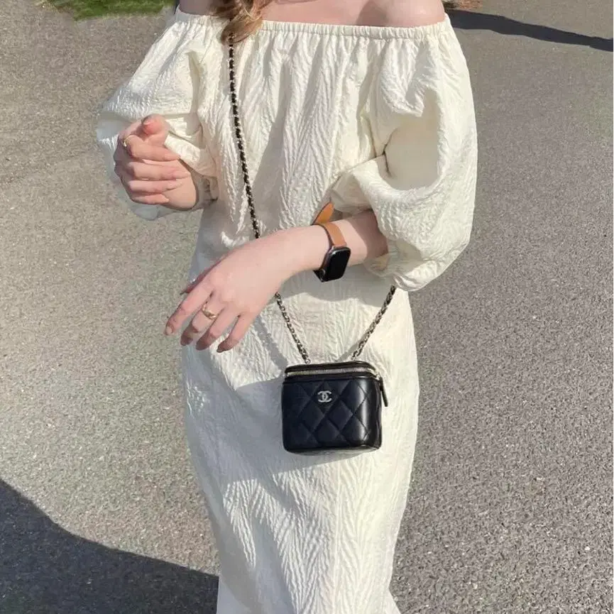아이보리 엠보싱 가공 원단을 사용한 퍼프 슬리브와 플레어 스커트가 돋보이는 롱 원피스. - 색상: 아이보리 - 소재: 엠보싱 가공 원단 - 디자인: 퍼프 슬리브, 플레어 스커트 - 소매: 밴딩이 들어간 퍼프 슬리브 택은 잘라져 있지만, 새 상품입니다.