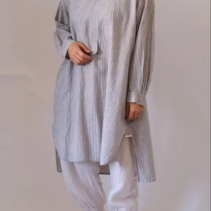 프렌치 빈티지 그랑파 셔츠를 기본으로 디자인 어레인지. 가슴 부분의 부자무와 허리 탭 등 오래된 튜닉 셔츠의 디테일을 도입하면서도 스트라이프 무늬가 돋보이도록 세련되고 심플한 디자인으로 완성했습니다. 일본산 소재 코튼 68 리넨 32 컬러 그레이에 네이비 스트라이프 계절감 봄, 여름 정가 24200엔 사이즈 F 어깨 너비 55 가슴 너비 63 소매 길이 48 기장 96 착용컷 162cm 보통의 사용감으로 눈에 띄는 데미지는 없습니다. 중고품이므로 세세한 점은 양해 부탁드립니다.