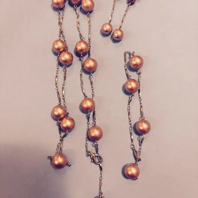 비즈 모양의 핑크 펄이 이어진 롱 목걸이. - 컬러: 핑크 - 소재: 펄, 금속 - 스타일: 롱 목걸이 - 디자인: 비즈 모양의 펄이 이어진 디자인 - 부속품: 없음 약 1cm 펄 직경 길이 약 80cm 방문해 주셔서 감사합니다.