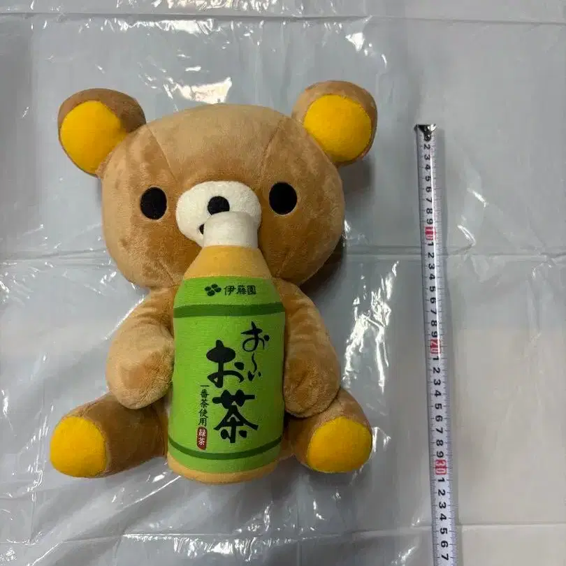 브라운과 노란색 곰 봉제 인형으로, 손에 차 보틀을 들고 있습니다. 오이 차 리락쿠마 - 캐릭터: 곰 봉제 인형 - 음료 보틀: 차 보틀 - 색상: 브라운과 노란색 - 사이즈: 약 30cm - 특징: 손에 들고 있는 음료 보틀 포함 방문해 주셔서 감사합니다