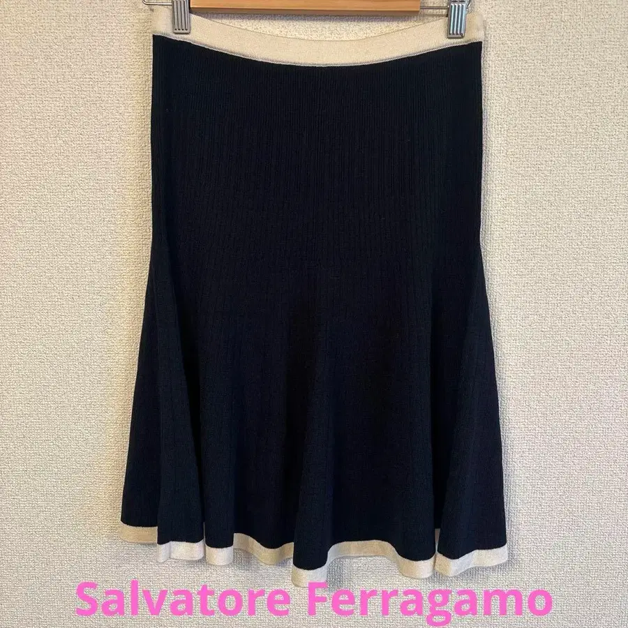 리브 니트 플레어 스커트, 네이비와 화이트 트림이 특징.