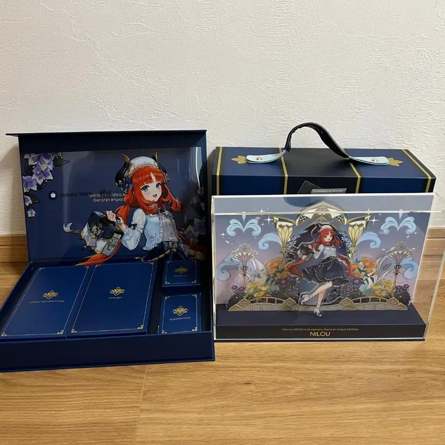 Samsung S23 Ultra 원신 닐루 콜라보 액세서리 세트입니다. 한국 한정으로 발매된 상품입니다. 구성품은 프로모션 코드를 제외하고 미사용입니다. 프로모션 코드는 사용된 상태이지만, 카드는 함께 동봉합니다.