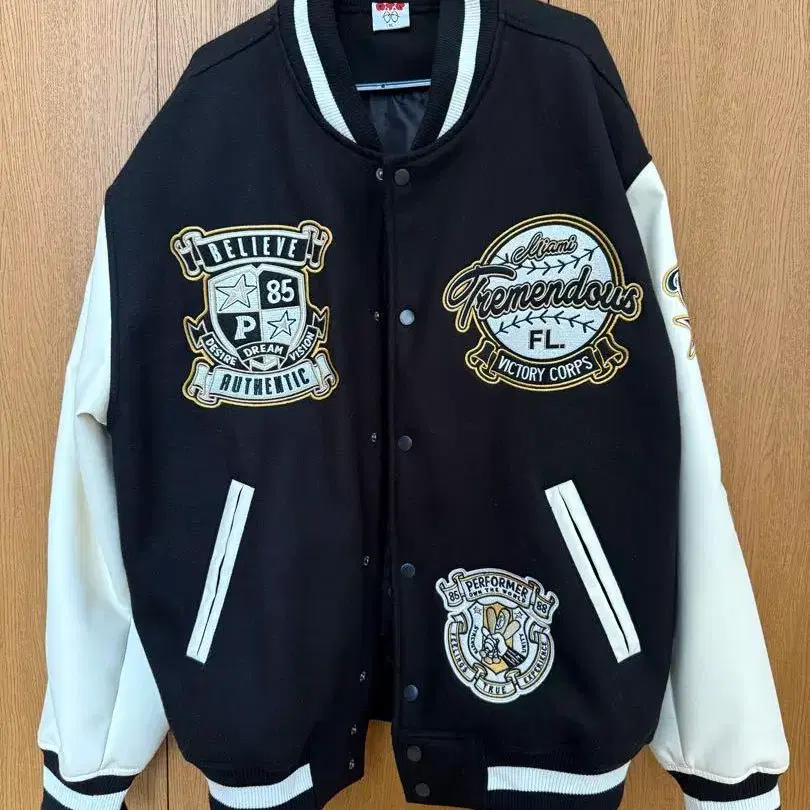 PAZZO 자수 가죽 긴팔 와펜 바시티 자켓