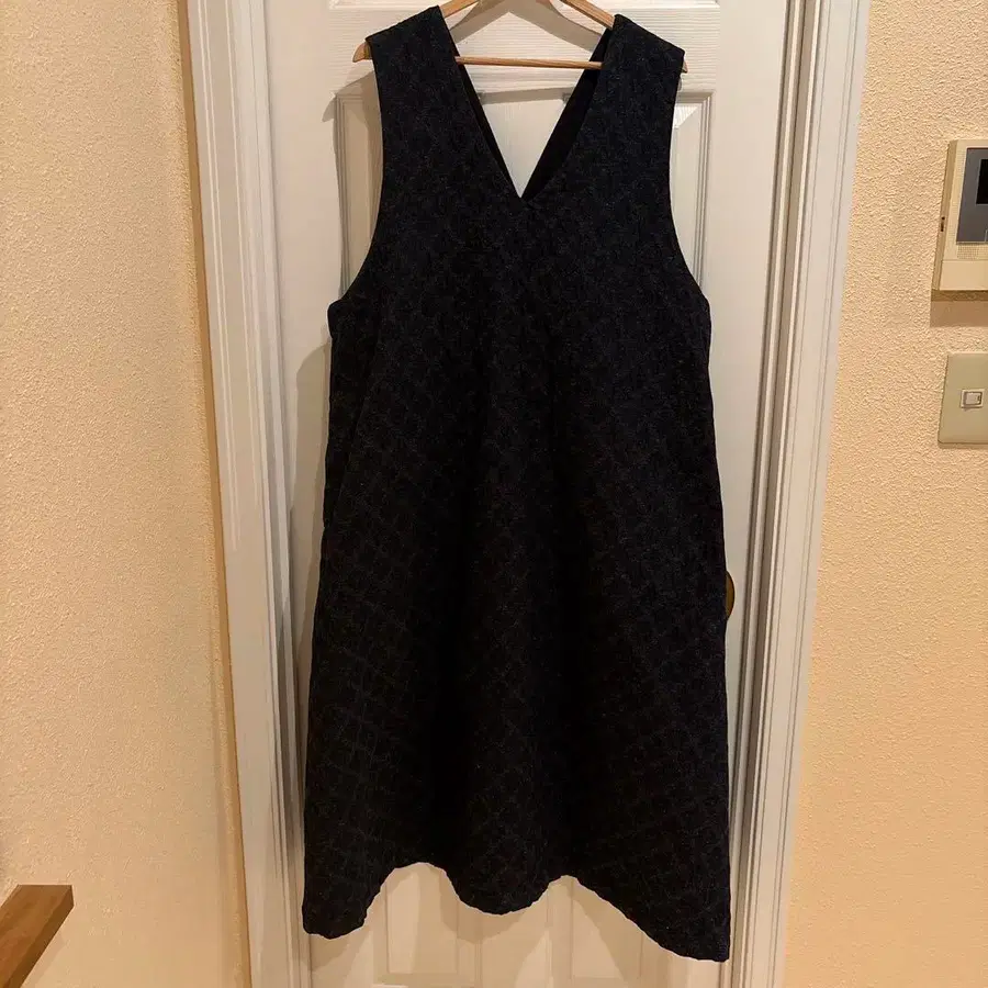 다크 네이비 V 넥 슬리브리스 원피스, 뒷면에 버튼이 달린 다이아몬드 패턴. 총길이 약 122 - 색상: 다크 네이비 - 디자인: V 넥 - 버튼: 뒤쪽에 버튼 - 패턴: 다이아몬드 패턴 방문해 주셔서 감사합니다.