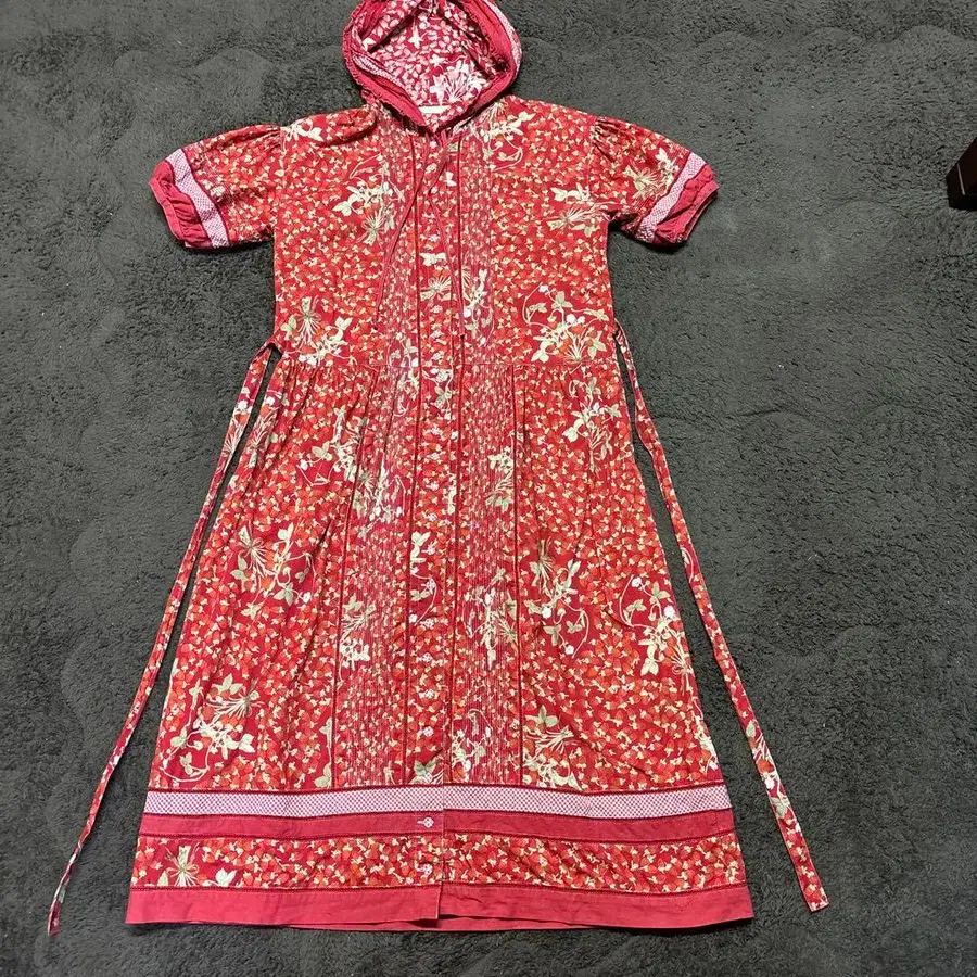 빈티지 핑크 하우스 딸기 무늬 후드 부착 원피스