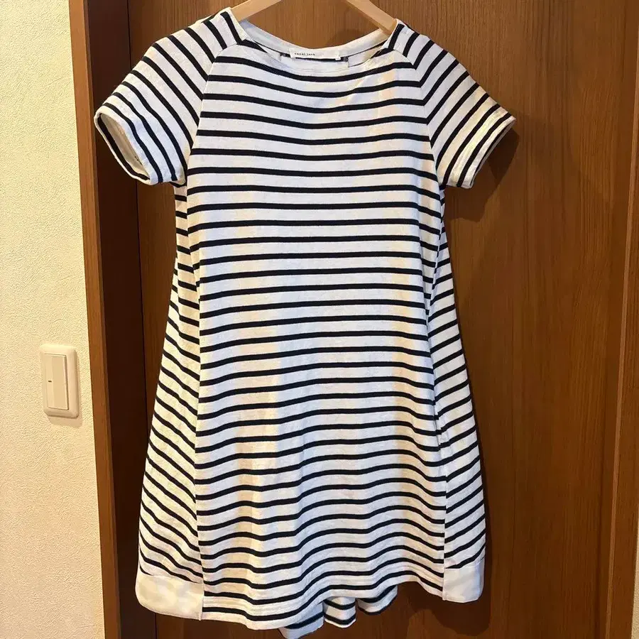 한 번 착용했습니다. 흰색과 감색의 보더 원피스입니다. 반팔, 양쪽 포켓 부착. 사이즈 1 155cm인 제가 입었을 때 밑단이 무릎까지 오는 길이입니다. #사카이 #럭 #사카이 무늬···보더 계절···봄 여름 색상···화이트 계열