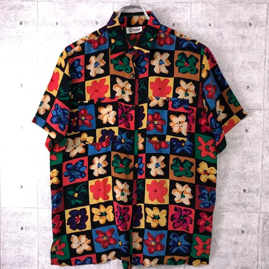 90년대 컬러풀 사이키 팝 구제 의류 가슴 포켓 꽃무늬 반팔 실크 셔츠