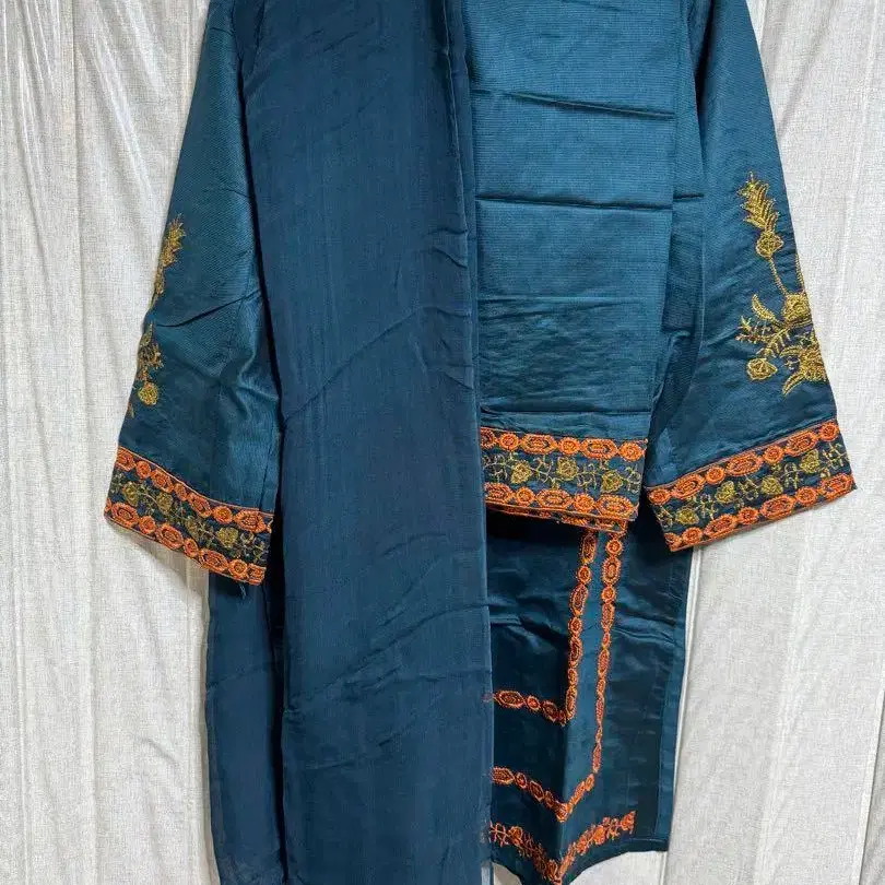 파키스탄 민족 의상 다크 틸 새틴 롱 드레스 3개 세트