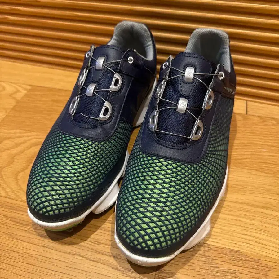 보아 시스템이 탑재된 네이비와 그린의 골프화.