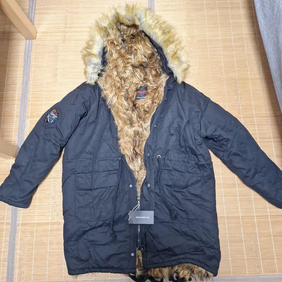 퍼 후드와 인디언 헤드 자수가 특징인 블랙 모즈 코트. - 브랜드: akatsuki-ko - 색상: 블랙 - 특징: 퍼 후드 - 택: 택 포함 새상품 - 디자인: 인디언 헤드 자수 방문해 주셔서 감사합니다.