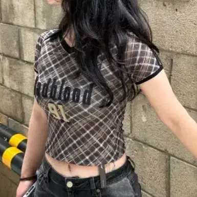 BADBLOOD 빈티지 클럽 V넥 체크 티셔츠 브라운