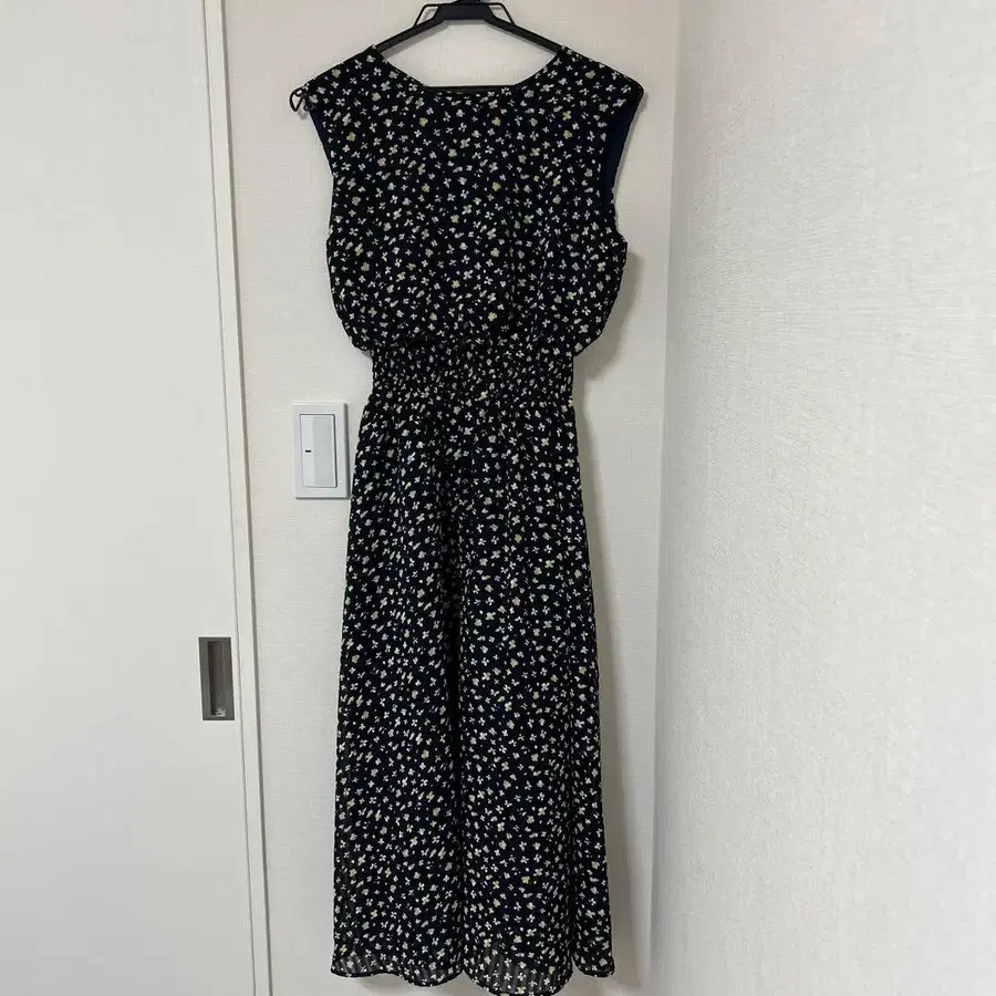 네이비에 화이트, 옐로우 플라워 패턴의 슬리브리스 롱 원피스. 허리 밴딩으로 핏감이 좋습니다. - 색상: 네이비, 화이트, 옐로우 플라워 패턴 - 스타일: 슬리브리스 - 디자인: 허리 밴딩이 있는 롱 원피스 얼룩, 찢김, 냄새 등... 없음