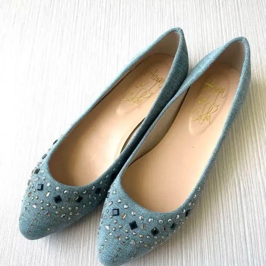 Agua Calida의 비쥬 장식 스카이블루 스틸레토 펌프스입니다. 전체적으로 반짝이는 디자인으로, 발가락 부분에는 비쥬가 장식되어 있습니다. 택은 없지만, 미사용 새상품입니다. 집에 보관하고 있었기 때문에, 신경 쓰시는 분은 삼가 주세요. 부탁드립니다. -브랜드: Agua Calida -컬러: 라이트 블루 -장식: 비쥬 포함 -소재: 천 -디자인: 포인트 토 펌프스