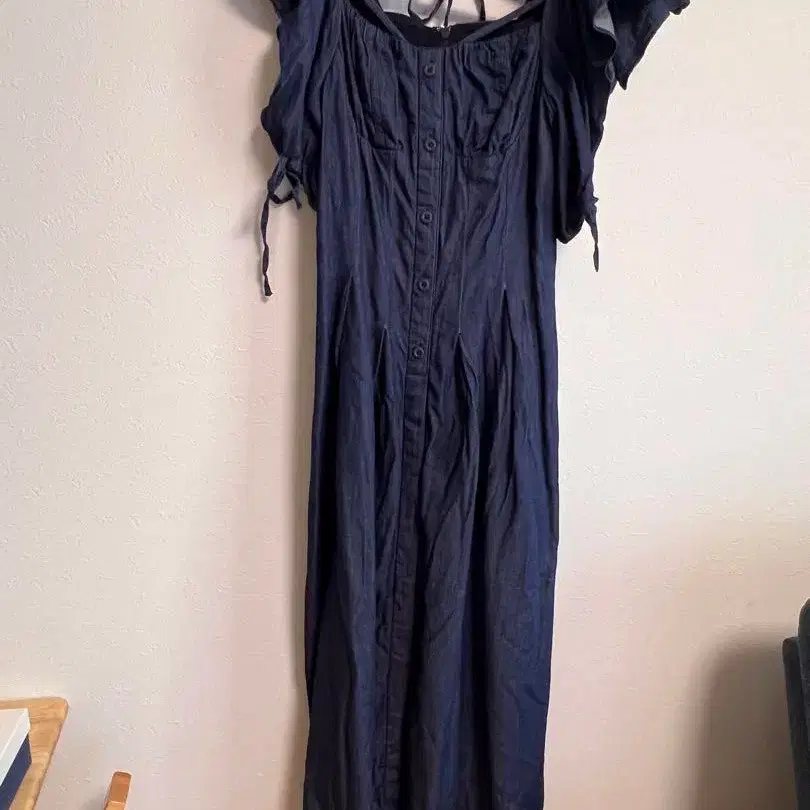 네이비 컬러의 코튼 소재, 프릴 슬리브의 롱 원피스. - 브랜드: SNIDEL - 색상: 네이비 - 사이즈: 00 - 소재: 코튼 100 - 디자인: 숄더 리본, 프릴 슬리브 방문해 주셔서 감사합니다. 3회 정도 착용, 세탁 완료 정가: ¥18000