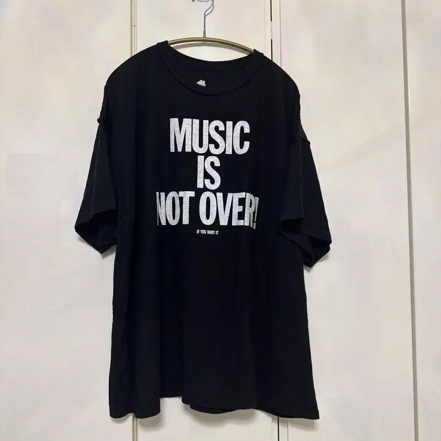 100% 코튼 블랙 티셔츠로 프린트 디자인이 특징입니다. - 컬러: 블랙 - 디자인: 프린트 (MUSIC IS NOT OVER!) - 소재: 코튼 100 - 사이즈: F (프리 사이즈) 구매 후 1회 사용 방문해 주셔서 감사합니다.