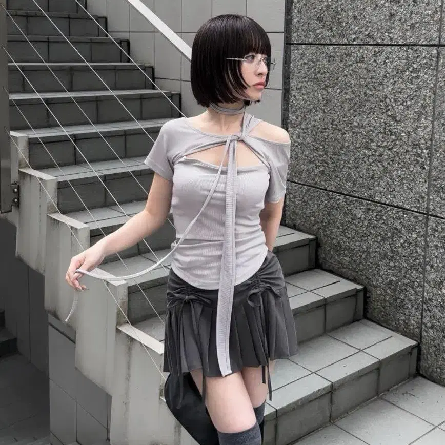 페리큐어 프론트 게더 플리츠 SK 스커트 그레이