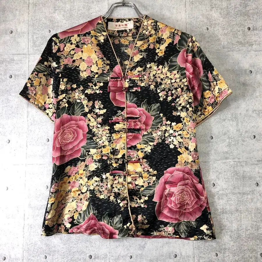 • IKUMI 새틴 반팔 셔츠 블랙 꽃무늬 자수 차이나풍