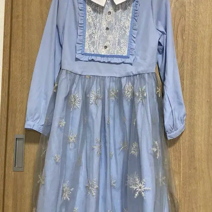 - 스커트 소재: 비침이 있는 소재, 눈꽃송이 자수 포함