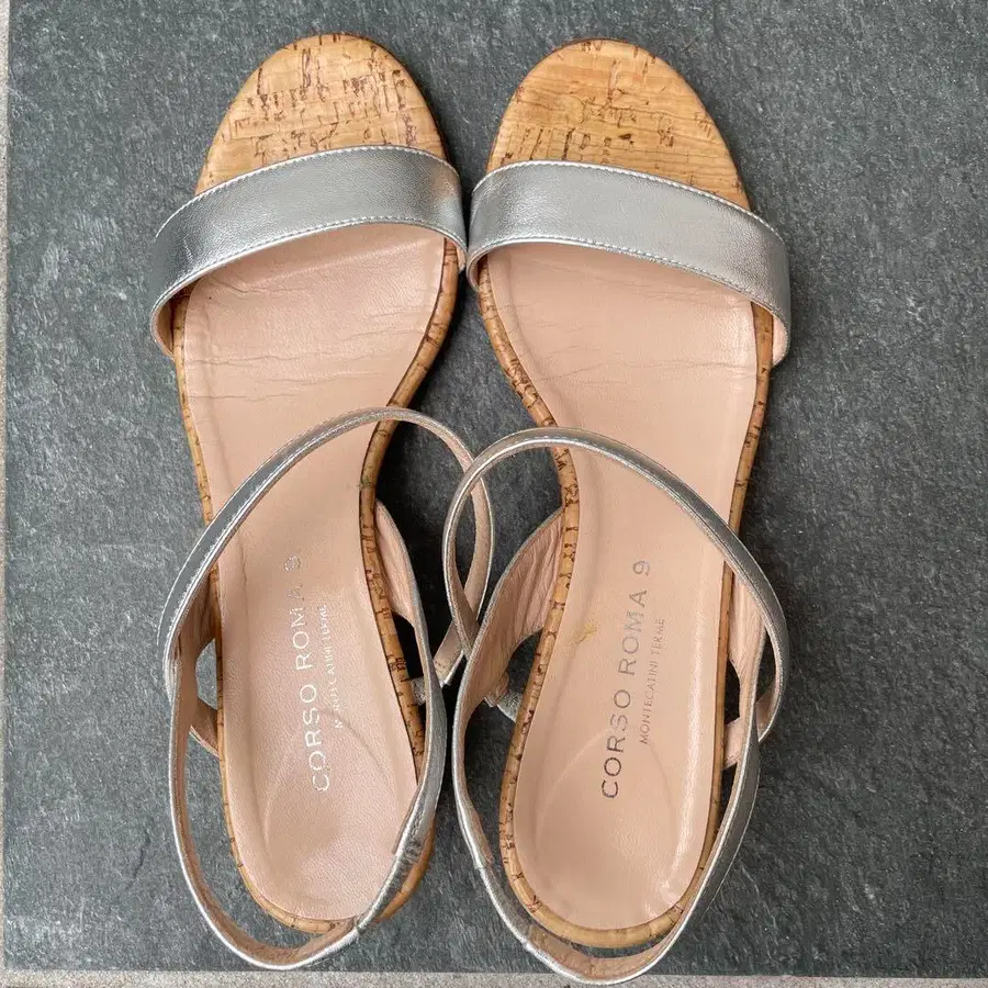 실버 합성 피혁과 코르크 소재의 샌들로, 약 5cm의 힐로 착용감이 쾌적합니다.
