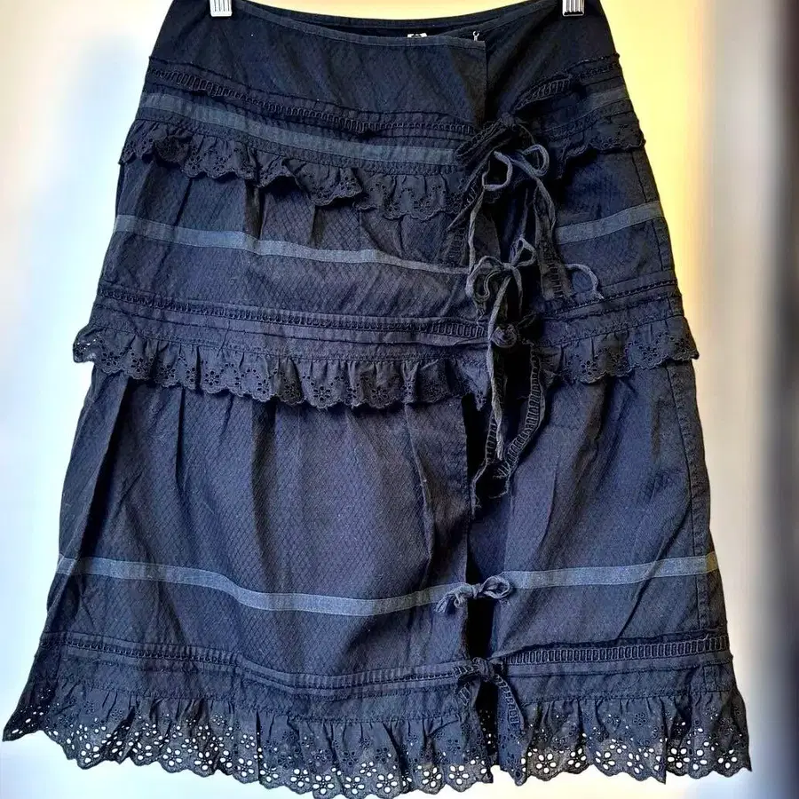 코튼 레이스 스커트 블랙 사이즈 6 허리 68 기장 60 코튼 레이스로 만든 랩 스커트입니다. 색상···블랙 계열 계절···봄/여름 얼룩, 찢김, 냄새 등···없음