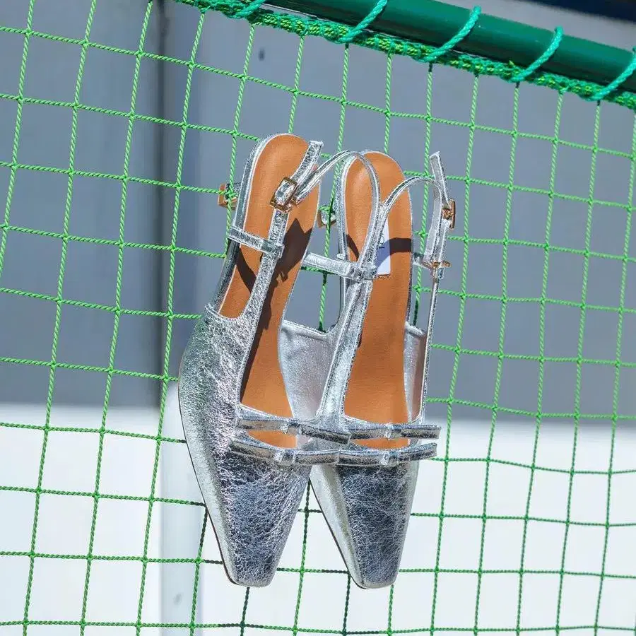 메탈릭 실버 슬링백 펌프스, 스틸레토 디자인으로 스타일리시합니다.