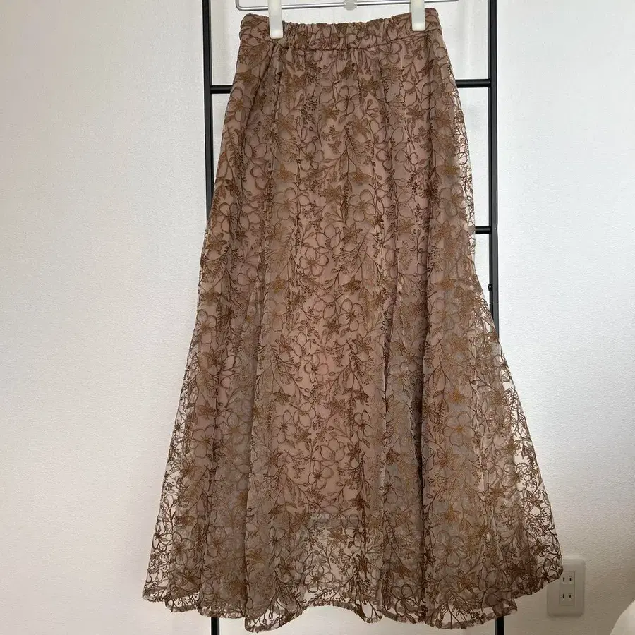 레이스 소재의 브라운 롱 스커트, 안감 부착으로 쾌적한 착용감. - 색상: 브라운 - 소재: 레이스 - 안감: 브라운 스커트 - 브랜드: RANDA 방문해 주셔서 감사합니다.