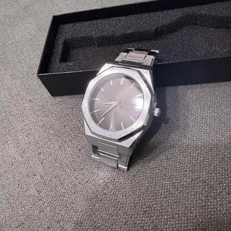 팔각형 스테인리스 스틸 케이스와 팔찌 밴드가 있는 그레이 쿼츠 손목시계. 방문해 주셔서 감사합니다.