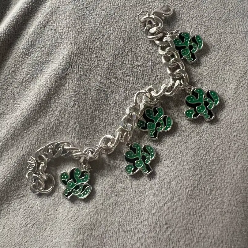 실버와 그린의 선인장형 참이 특징인 팔찌. - 디자인: 선인장형 참이 달린 팔찌 - 컬러: 실버와 그린 - 소재: 금속제 - 특징: 복수의 클로버 참이 연결된 디자인 방문해 주셔서 감사합니다.