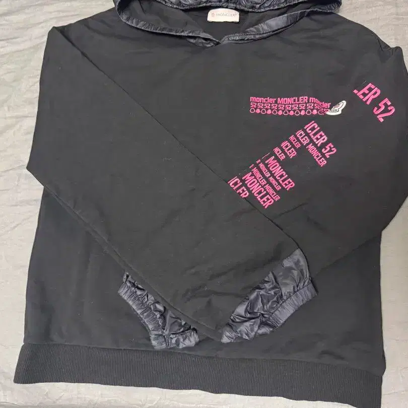 자동 번역되었어요. 원문보기후드가 부착된 블랙 후드티, 몽클레어의 CHEVIRIL GIUBBOTTO 모델, 프린트 디자인.