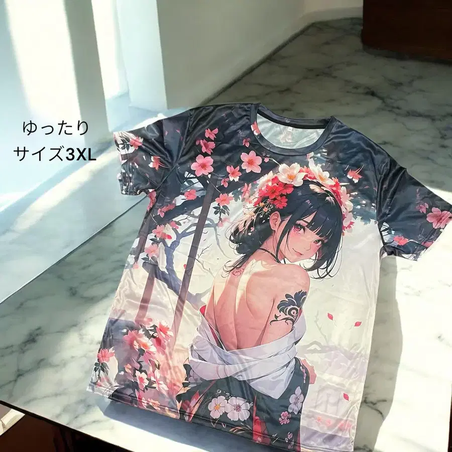 애니메이션 캐릭터와 벚꽃이 프린트된 3XL 사이즈의 루즈한 티셔츠.