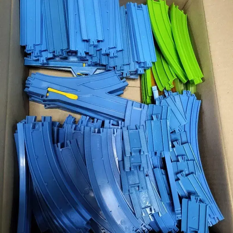다양한 파랑과 녹색의 프라레일 레일 세트, 직선과 커브가 포함되어 있습니다. - 색상: 파랑, 녹색 - 아이템 타입: 프라레일 레일 - 아이템 수: 다수 - 모양: 직선 15, 중 25, 소 18 오렌지, 녹색, 스카이블루(에코 레일) 5 커브 54, 오렌지, 녹색 10 스톱 4  턴 아웃 레일 7 색바램, 씰 자국, 노란색 부분의 왜곡 등 사용감이 있습니다. 이음매에 강한 힘을 가하면 깨질 수 있습니다. 이 점 양해 후 구매하시기 바랍니다. 기타 프라레일 용품도 다수 판매 중입니다. 낱개 판매, 묶음 판매도 가능하므로 상담해 주시기 바랍니다. (일부 불가능한 경우도 있습니다.)