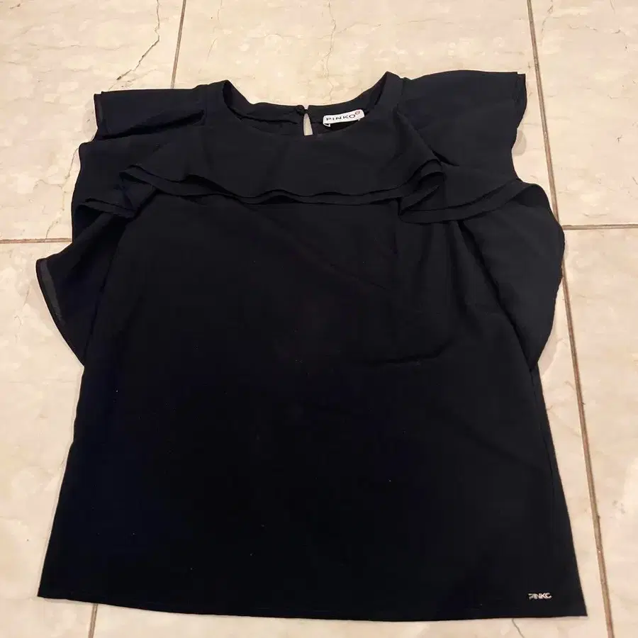 프릴 디자인의 블랙 반팔 상의. - 브랜드: PINKO - 색상: 블랙 - 디자인: 프릴 포함 - 로고: PINKO - 스타일: 반팔 방문해 주셔서 감사합니다.
