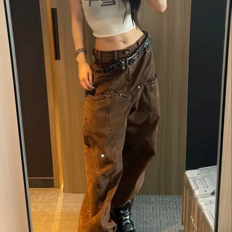 Praia 데님 이소재 스트라이프 와이드 팬츠 카고 포켓