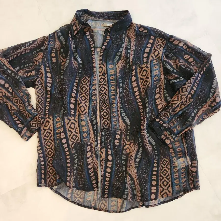 기하학 패턴의 긴팔 셔츠, S 사이즈, 파랑, 핑크, 블랙 배색. 주름이 잘 생기지 않아 겉옷으로 적합합니다. 방문해 주셔서 감사합니다.