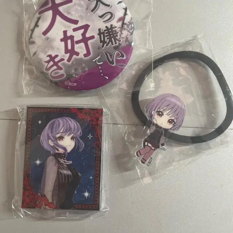 캔 배지, 미니 아크릴 스탠드, 머리끈 3종 세트입니다.
