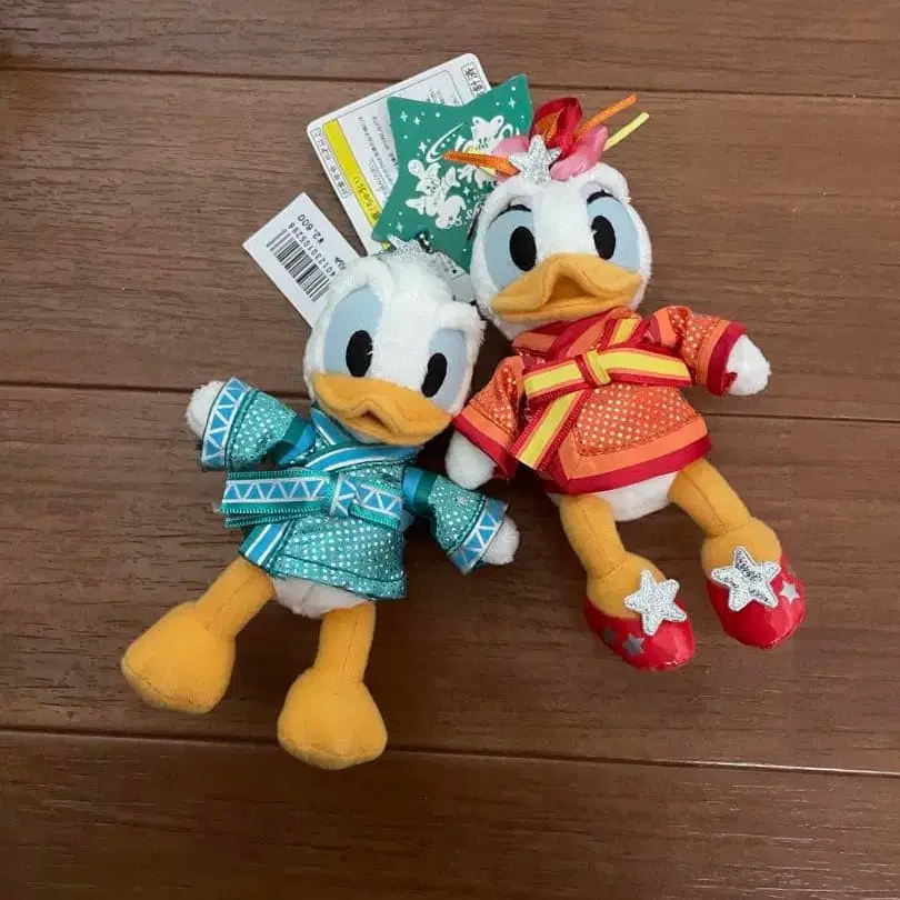 도널드 덕과 데이지 덕의 귀여운 봉제 인형입니다. 칠석 의상을 입고, 특별한 디자인이 적용되어 있습니다.