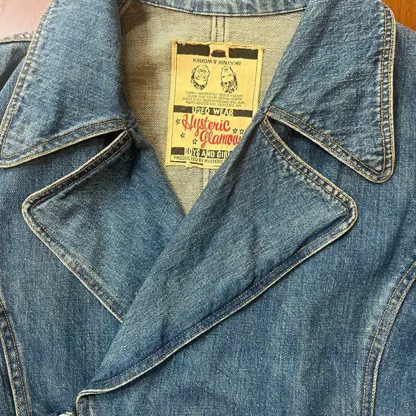 더블 지퍼가 달린 블루 데님 롱 자켓입니다. 백 슬릿이 있습니다.