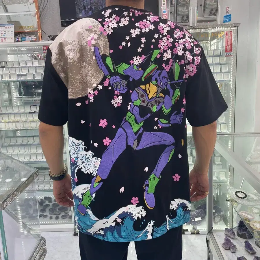 (4) 에반게리온 창간호 자수 티셔츠 아라나미 벚꽃 디자인 블랙